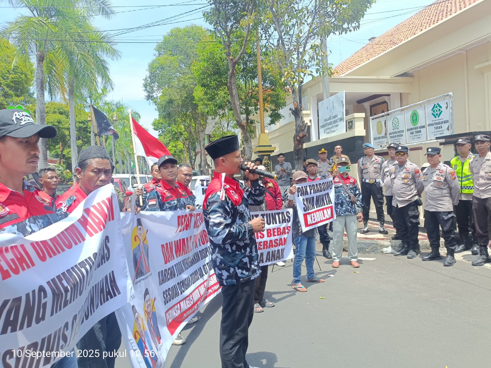 Tuban – Puluhan masa aksi yang tergabung dalam Aliansi Sekretariat Bersatu yang terdiri dari LSM Generasi Masyarakat Adil Sejahtera (GMAS), Ormas Pemuda Pancasila (PP), dan LSM Lembaga Investigasi Negara (LIN) menggeruduk gedung Pengadilan Negeri (PN), dilanjutkan ke Kejaksaan Negeri (Kejari), dan Dinas Sosial Pemberdayaan Perempuan Perlindungan Anak dan Pemberdayaan Masyarakat Desa (Dinsos P3A PMD) Tuban siang tadi (10/09/2025), buntut vonis bebas terdakwa kekerasan pada anak oleh majelis hakim PN Tuban sebulan yang lalu.