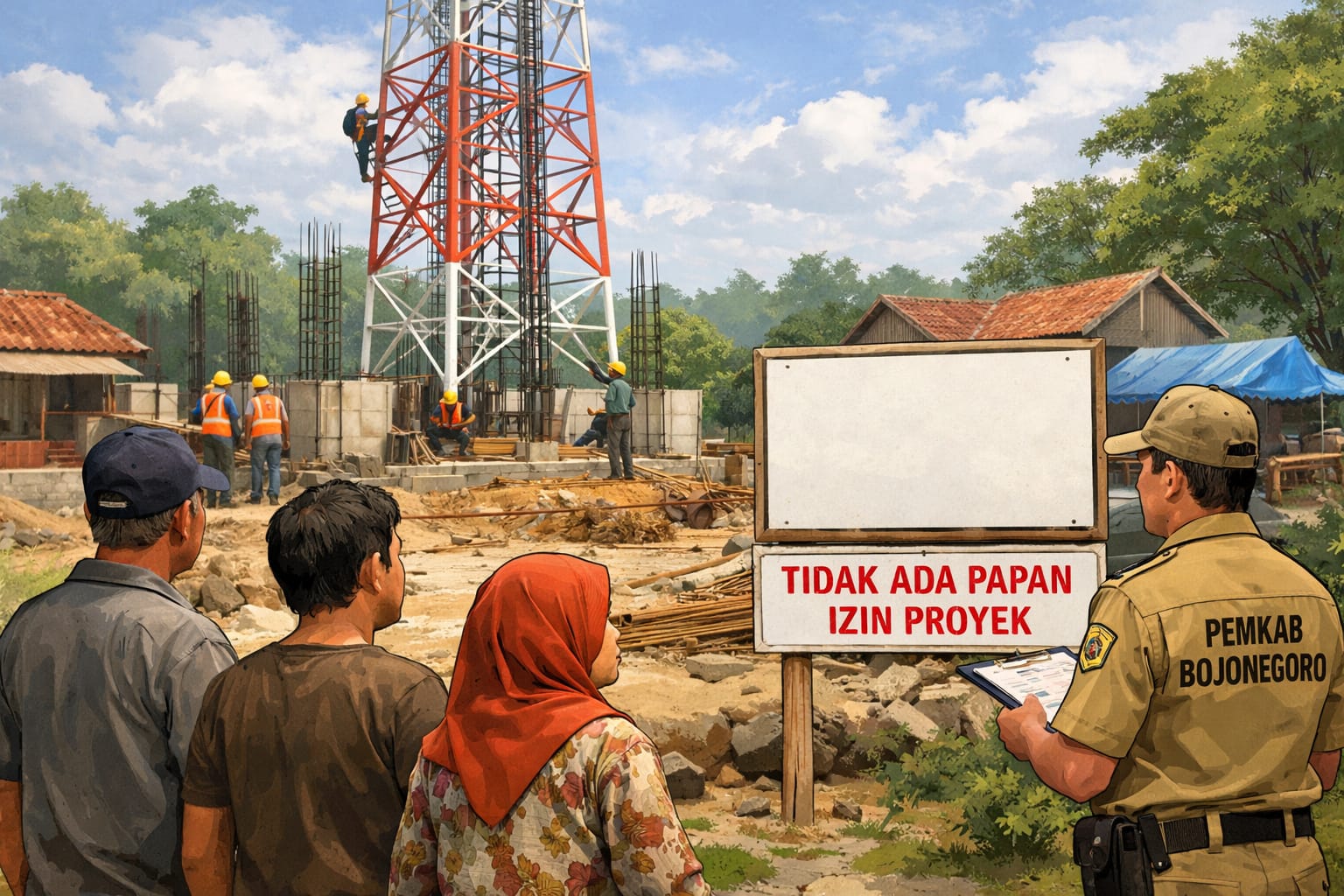 Bojonegoro – Pembangunan sebuah menara telekomunikasi (tower) yang masih dalam proses pengerjaan di Desa Jari, Kecamatan Gondang, Kabupaten Bojonegoro, menuai perhatian warga. Proyek tersebut diduga belum dilengkapi dokumen perizinan resmi sebagaimana diatur dalam ketentuan perundang-undangan yang berlaku.